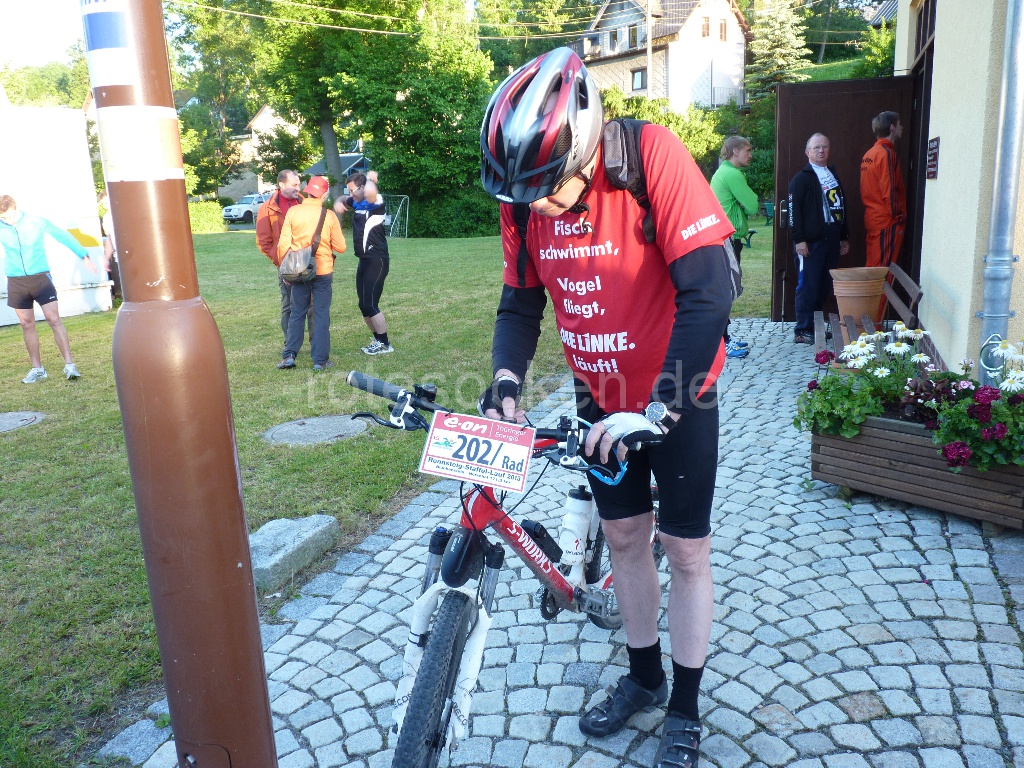 Bevor es am Samstag sportlich zuging, wurden unsere Läufer am Freitagabend durch die Landtagsabgeordneten Ralf Kalich und Frank Kuschel mit allerlei Lach- und Sachgeschichten rund um den Rennsteig beglückt. Doch nicht nur verbal waren die Abgeordneten gut dabei, immerhin begleiteten sowohl Frank Kuschel (MdL) als auch Jens Petermann (MdB) die Socken auf dem Mountainbike über drei bzw. vier Etappen von Blankenstein bis Neuhaus am Rennweg und ab Oberhof bis ins Ziel nach Hörschel. Aber nicht nur Mandatsträger traten für die Socken in die Pedale, auf den Etappen von Neuhaus bis nach Oberhof begleitete und versorgte uns Ronald und auf den letzten beiden Etappen ließen es sich Alex und Christoph nicht nehmen sich für je eine Etappe auf das Rad zu schwingen und die Läufer zu begleiten.