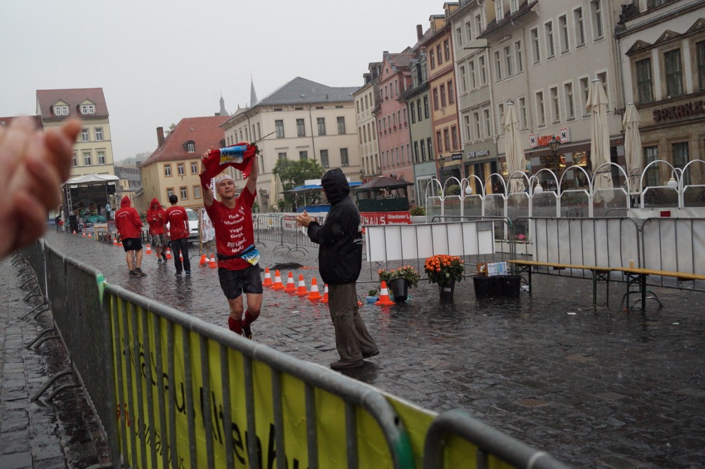 Chris lief aufgrund des Wetters und unerklärlicher Trainingsrückstände nach der ersten Runde, sprich nach einem Halbmarathon ins Ziel und wartete dort auf Alex, welcher sich in eine sehr schwere zweite Runde begab. Hier setzte das Wetter nicht nur der Roten Socke zu, denn noch nie hat man in Altenburg so viele Leute nur gehen gesehen, anstatt zu laufen. Über die Zeiten schweigen wir an diesem Tag einfach, die sind bei dem Wetter auch gar nicht wichtig. Wichtig war, dass alle gesund im Ziel ankamen. Und als sich Alex auf den letzten Kilometer begab und Joes Trikot vor sich über die letzten Meter ins Ziel trug, öffnete der Himmel seine Schleusen und es gab einen Gewitter-/Hagelschauer der sich sehen lassen konnte. Mehr Symbolik geht manchmal auch nicht. So kam eine sehr nasse Rote Socke, angefeuert von einem mindestens genau so nassen Fanclub mit gemischten Gefühlen ins Ziel.