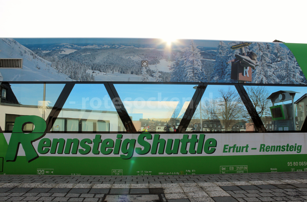 Aber so? – War es die Stunde der B-Pläne. Anfang Februar 2016 hatten eine Handvoll unverzagter Roter Socken die Reise zu Rennsteig-Gastgeber Ronald Unger angetreten – in die Stadt mit Deutschlands höchstgelegenem Normalspur-Bahnhof. Was? Ihr wisst nicht, welche Stadt das ist? Nun, die drei Einzelteile dieser Stadt gehörten früher zu drei verschiedenen Fürstentümern (Schwarzburg-Rudolstadt, Sachsen-Coburg und Sachsen-Meiningen), bevor die Köhler, Pottaschbrenner, Glasmacher, Kienrußbrenner, Harzscharrer, Kustelölmacher, Zimmerleute und Holzfäller das Recht erhielten, auf dem Marktflecken am Neuen Haus einen Jahrmarkt abzuhalten. Fortan gab es kein Halten mehr: Das Thüringer Glas trat seinen Siegeszug um die ganze Welt an. Wie? Ihr meint, das sei übertrieben? – Dann wisst ihr noch nicht, dass die wunderbunt glitzernden Weihnachtsbaum-Glaskugeln vor anderthalb Jahrhunderten von eben jenen Greiners und Müllers erfunden wurden, deren Namen auch heute noch viele Klingelschilder in der Region zieren. Aus purer Not!, weil die Greiner-Müllers zwar jede Menge Glas hatten, sich aber kein Dörrobst leisten konnten, mit welchem vordem die Weihnachtsbäume geschmückt wurden. Not macht eben erfinderisch.