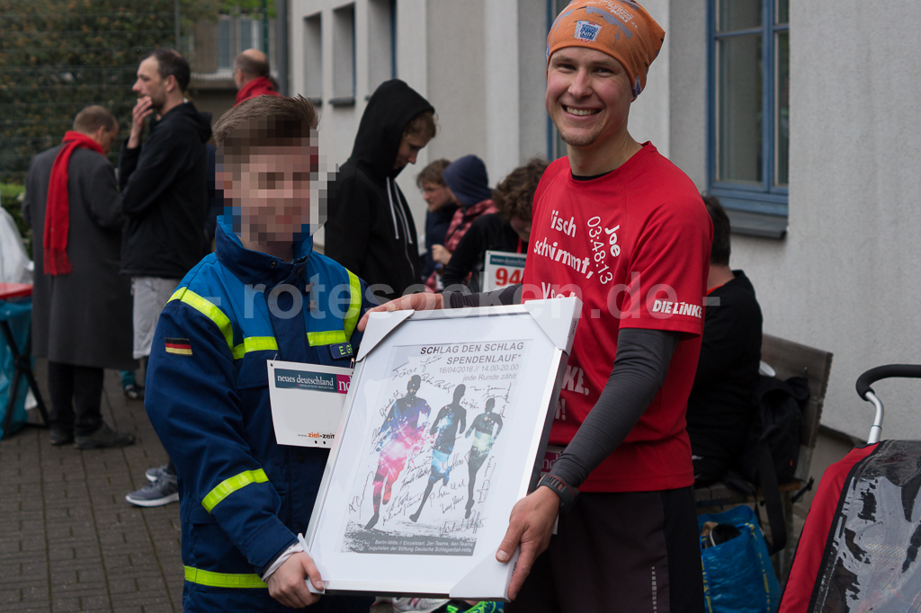 Die bewegendsten acht Runden absolvierte jedoch ein Anderer. Thilo war eigentlich zum Lauf gekommen, um den Stand der Stiftung Deutsche Schlaganfall-Hilfe zu betreuen. Doch irgendwann packte den jungen Mann, der schon kurz nach der Geburt einen Schlaganfall erlitt, der tiefe Wunsch, ebenfalls aktiv zu werden. Kurzerhand fanden sich ein paar Leute zusammen, die ihm die Startgebühr sponserten und Thilo drehte gemeinsam mit Patrick aus dem Team „Defizitsünder“ unter Applaus seine Runden. Als Anerkennung für diese tolle Leistung bekam er zwei Eintrittskarten für ein Heimspiel des 1. FFC Turbine Potsdam überreicht.