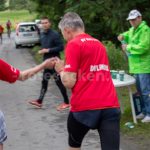 Mitten in den Wiesen von Grumbach erfolgte der erste Wechsel und Andrea übernahm den Staffelstein. Für sie waren die ersten Kilometer mehr Qual als Freude, was vor allem am Streckenuntergrund lag. Wurzeltrails und teilweise steile Abstiege, gepaart mit sehr aufgeweichtem Boden raubten ihr den letzten Nerv. Kaum besserten sich die Bodenverhältnisse nahm Andrea ihr gewohntes Tempo auf und bewältigte ihre 19km, um an der Schildwiese an Harald zu übergeben. Dieser spulte seine 16km unaufgeregt, schnell und ausgesprochen souverän ab. Dabei gilt es auf dieser Passage einen der härtesten Anstiege des ganzen Laufes zu absolvieren.