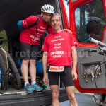 Währenddessen holte sich Stefan eine ordentlichen Platzregen ab, ebenso wie Melanie, welche zwei Etappen später an der Reihe war. Dazwischen lief Robert die mit 20km längste Etappe von Allzunah nach Oberhof, in einer beeindruckenden Zeit von 1:34:44. Allerdings hatte Robert mit Ronald und Anette gleich zwei Radbegleitungen, da ist es ja auch logisch, dass er doppelt so schnell ist. Kaum war der Wechsel vollzogen war Melanie die zweite Socke, welche eine kostenlose Dusche von oben bekam. Während Jens mit Alex zum nächsten Wechsel fuhr, machte sich der Rest der Reisegruppe Sonnenschein schon auf den Weg zum Kleinen Inselsberg und trainierte in einer weiteren Sportart: Sommerrodeln. In Oberhof wechselte auch letztmalig die Radbegleitung und Toni übernahm von Ronald. Toni fuhr stellvertretend für Frank, der in den letzten Jahren immer unser treuer Mountainbiker war. Gleichwohl war Frank auch vor Ort und möchte nächstes Jahr die Seiten wechseln und als Läufer ins Geschehen eingreifen.