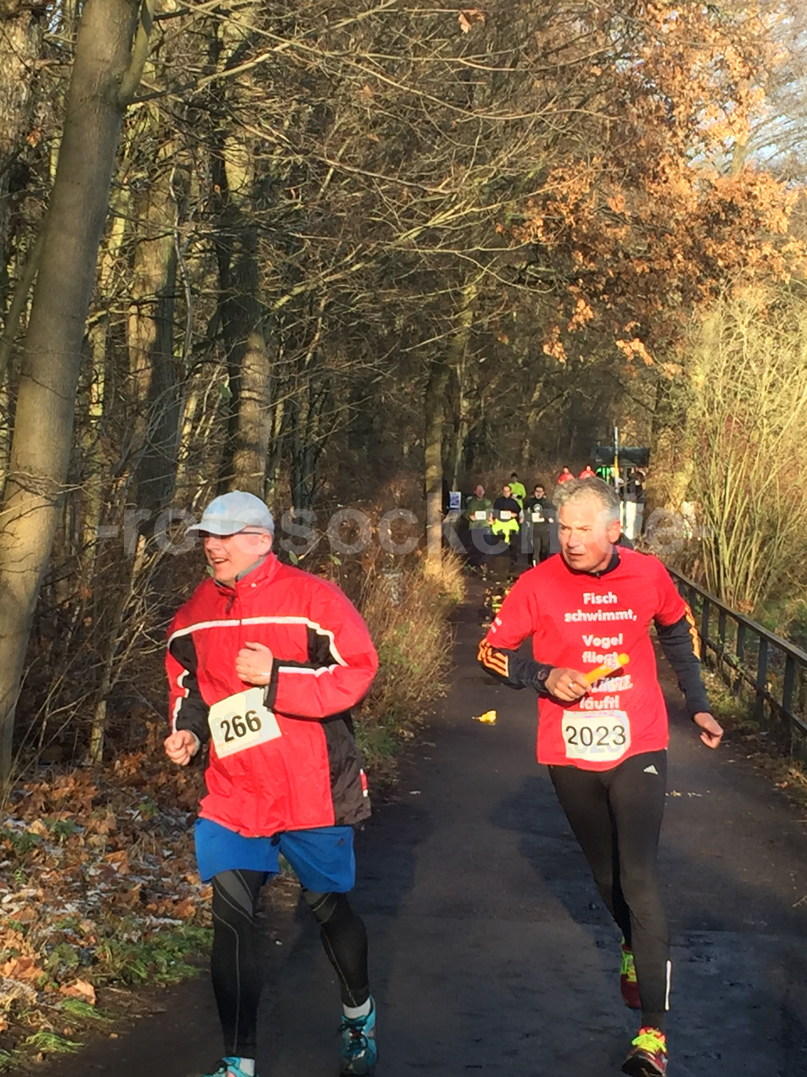 Bei schönem aber frischem Wetter ging es auch auf die ersten 5 Kilometer. Natürlich wieder mal zu schnell angegangen musste ich zeitig dem körperlichen Verfall Tribut zollen. Die Nase lief viel besser als die Trainigsvorbereitung. Andere Läufer nutzten mein personalisiertes Laufshirt um mich kurz vor dem Zusammenbruch zu motivieren: „Na los Olaf! Sonst wird das nie was mit der Revolution.“ So wurde ich doch noch ins Ziel gepeitscht, wo mir Harald den Stab entriss. Inzwischen war auch Jürgen als Betreuer eingetroffen, der auch Wolframs Shirt mitbrachte. Die Laufzeiten wurden immer besser. Schon nach einem Glühwein war Harald wieder da, um an Stefan zu übergeben. Weitere CheerleaderInnen unterstützten uns inzwischen, und Glühwein und Pulsnitzer Lebkuchen hielten die Stimmung oben. Der letzte Wechsel lief etwas holprig, weil Wolfram noch zu lange sein Trikot richten musste. Aber auch er holte es mit einer Bombenzeit wieder raus.