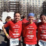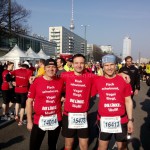 Nach den ersten 10km stand dann zumindest für Alex und Chris aber fest, dass in Anbetracht der bevorstehenden Wettkämpfe – vor allem dem respekteinflößenden Mt. Everest Treppenlauf in Radebeul in 2 Wochen – heute keine Höchstleistungen gefahren werden sollten. Joe hatte sich zunächst auf den ersten Kilometern abgesetzt, wurde dann aber wieder aufgegabelt. Unglaublich oft wurden die Socken dieses Mal auch auf ihre attraktiven Laufshirts angesprochen. Auch von den jubelnden Massen wurde der Spruch auf unseren Shirts hier und da laut den Umherstehenden vorgelesen – so soll es sein, kann man da nur sagen.