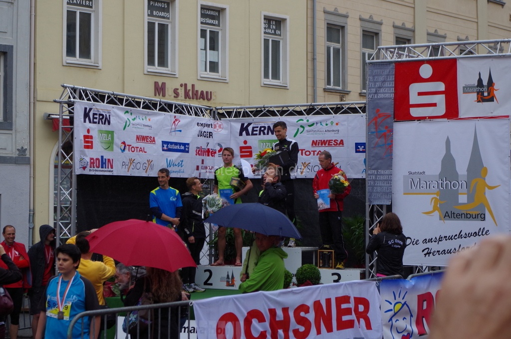 Und wie erging es den beiden Socken? Mit guten Wünschen des Bundestagsabgeordneten Frank Tempel und der Lokalpolitikerin Mandy Eißing ausgestattet und wie jedes Jahr vom Fanclub kräftig angefeuert, lief sich die erste Runde fast wie von selbst. Doch auch der Fanclub musste auf Dana, eine unserer treusten Fans, verletzungsbedingt verzichten. Der übrige Fanclub machte in Form von Tina, Christoph und Wolf jedoch jede Menge Lärm. Wie bereits im vergangenen Jahr haben sich nicht nur die Socken, sondern auch viel andere Aktive an die Fabel von Hase und Igel erinnert. Der Fanclub war immer schon da. In der zweite Runde kamen dann die Probleme. Josef haderte mit den Bergen, Alex mit seinem Rücken und am Ende beide mit dem kurzen Regenschauer. Vor allem Josef erinnerte sich wahrscheinlich in der zweiten Runde des öfteren an seinen Vorsatz aus dem letzten Jahr: „Ich bin kein Bergläufer, hier laufe ich wohl nur noch Halbmarathon.“ Naja. Alex hingegen plagte sich mit einer leichten Blockade im Rücken, welche vor allem in der zweiten Runde wenig Freude bereitete. Kurz vor dem Zieleinlauf auf dem Markt wartete Josef dann auf die kurz hinter ihm liegende zweite Socke und so konnten beide gemeinsam nach wenig Rekordverdächtigen 4:40:53 bzw. 4:40:54 gemeinsam ins Ziel laufen. Egal, auch dieses Finish kann ihnen niemand mehr nehmen.